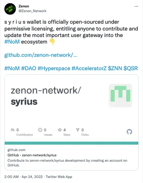 Zenon has a stated aim of replicating this ethos of: “Don’t trust, verify.” In late November 2021 the first version of the SYRIUS wallet was released. There was no visible code, and running a node required a bit of computer know-how. Just a few months later in late April 2022, the fifth version of the SYRIUS wallet was released. It is fully open-source and has the node embedded within the wallet, making it as simple as clicking a button (admittedly, my Zenonized grandma may still need help with this). Now anyone can run their own node to make the network fully verifiable. It is still early days for Zenon, but so far they have consistently hit every milestone. Currently a grant program is running which allows anyone to submit a project proposal to build on Zenon and receive funding from the DAO. ZIPs (Zenon improvement proposals) may be closer than we think. Only a matter of time until they reach their stated goal of making the entire project open-source.
