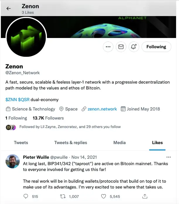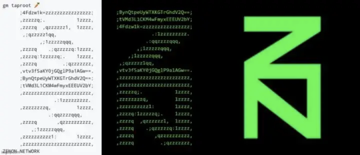 A huge milestone for Bitcoin was the taproot upgrade in Nov 14th, 2021. The improved security, privacy and programability was hotly anticipated in the crypto community at large. New use-cases are now possible, including and especially smart contracts on Bitcoin. The Zenon team took BTC donated from the community to leave a special message in ASCII art on block 709 632. One of Zenon’s only two likes is also for one of the chief architects behind Taproot, Pieter Wuille. It seems taproot is integral to Zenon’s plans.
