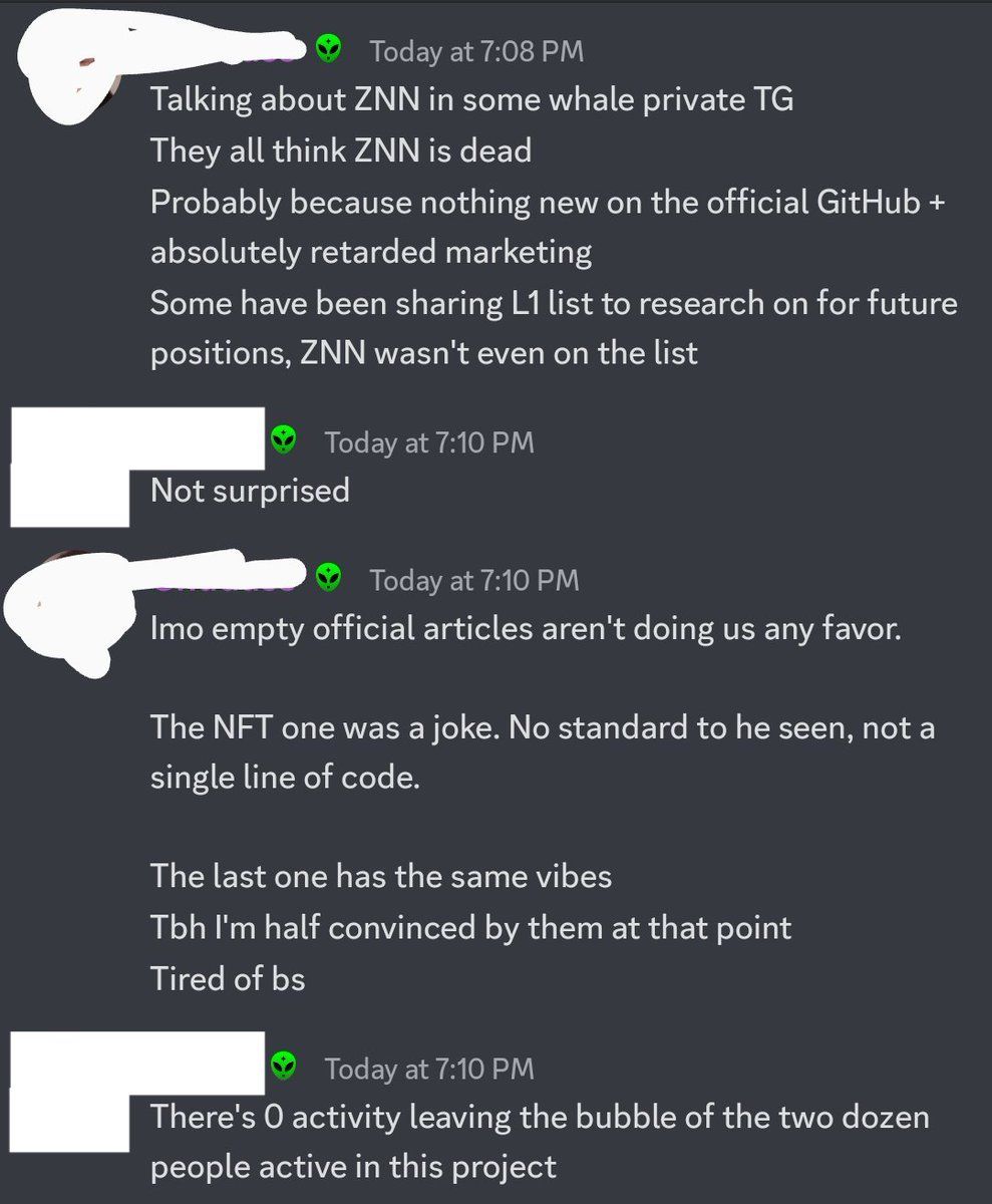 Zenon Network has been under development for over three years. The community developers have been building in the shadows and without fanfare. According to one community member his private whale Telegram chat has nothing good to say about ZNN. Check out that discussion below.