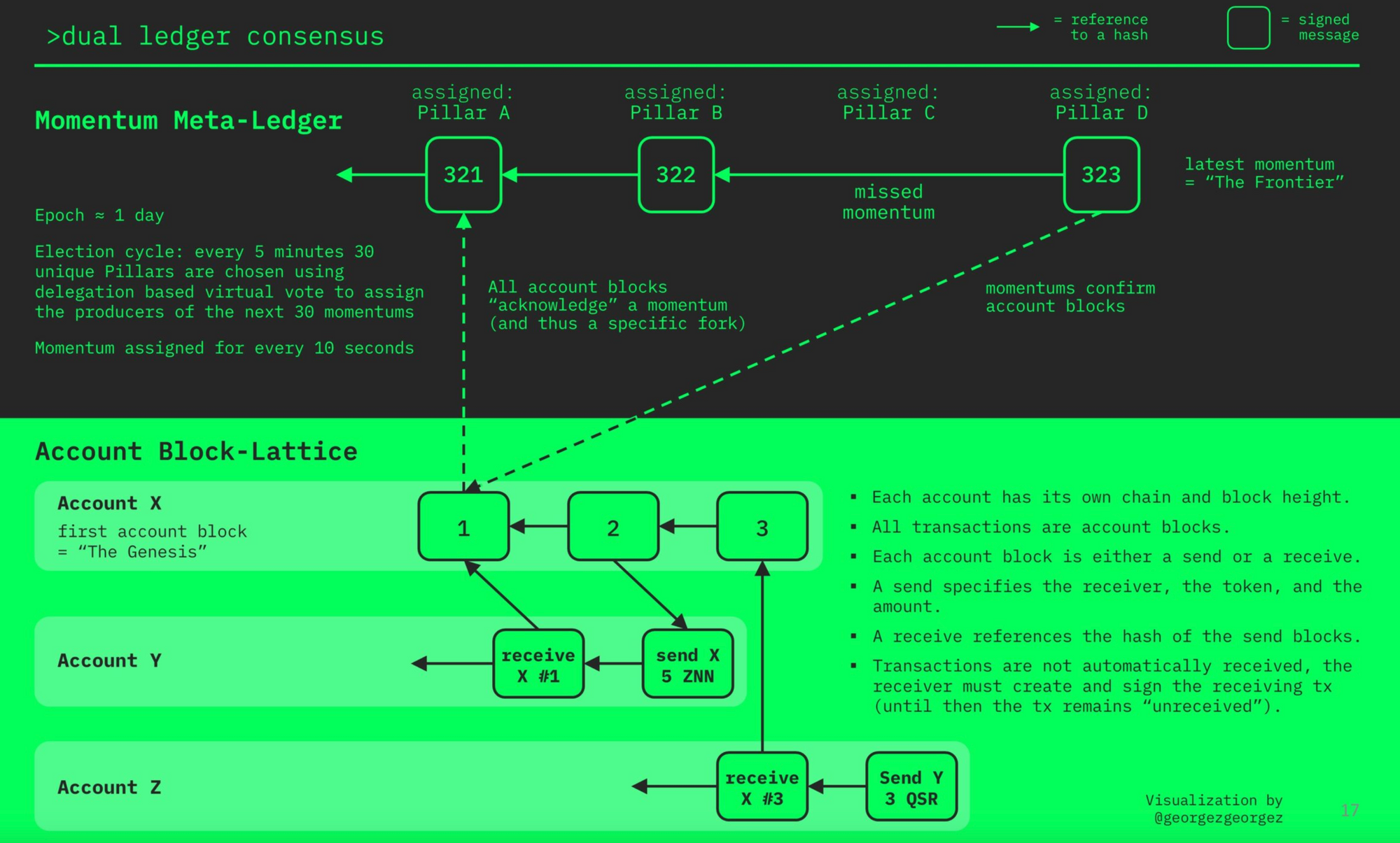 A Meta-DAG is a type of dual ledger architecture unique to Zenon Network. The architecture consists of two ledgers: a transaction ledger and consensus ledger.