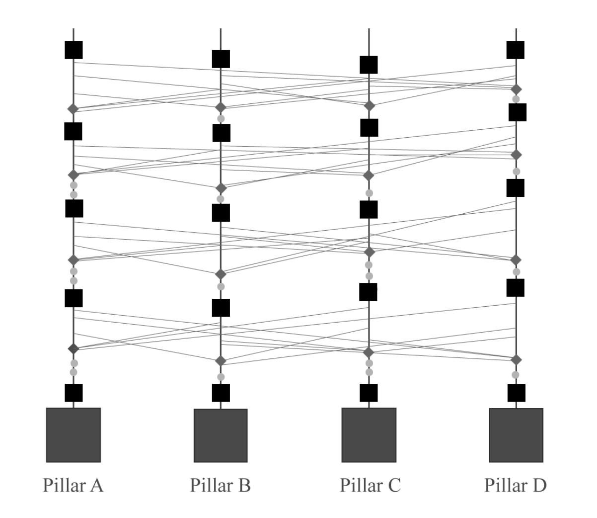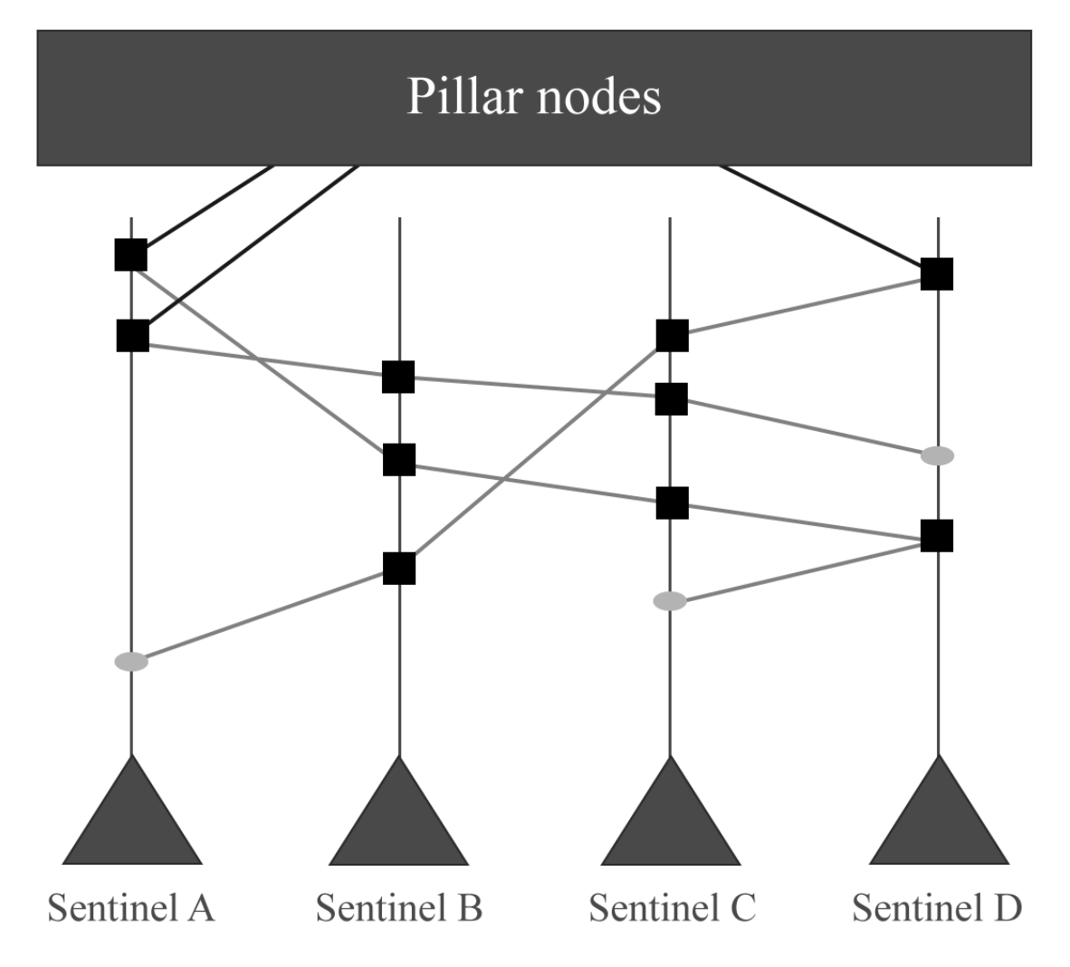 Transactions in the user account chain will be emitted to Sentinels before being sent to Pillars for consensus. Sentinel nodes prove the receipt of the transaction by adding a small PoW computation and other additional data (e.g. digital signature, metadata), then they relay that transaction to another random sentinel node, forming PoW links. A minimum of three hops are required with an upper bound dynamically imposed by a difficulty parameter. When the PoW link is complete, the transaction is sent to a pseudorandomly chosen consensus node called a Pillar Node.