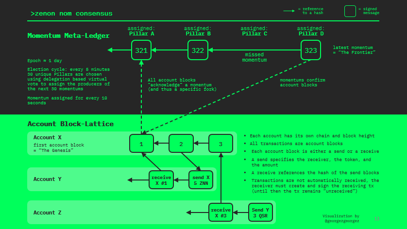Every five minutes 30 unique Pillars are selected to validate blocks called Momentums. Momentums are created every 10 seconds. Momentums are grouped into epochs for consensus.