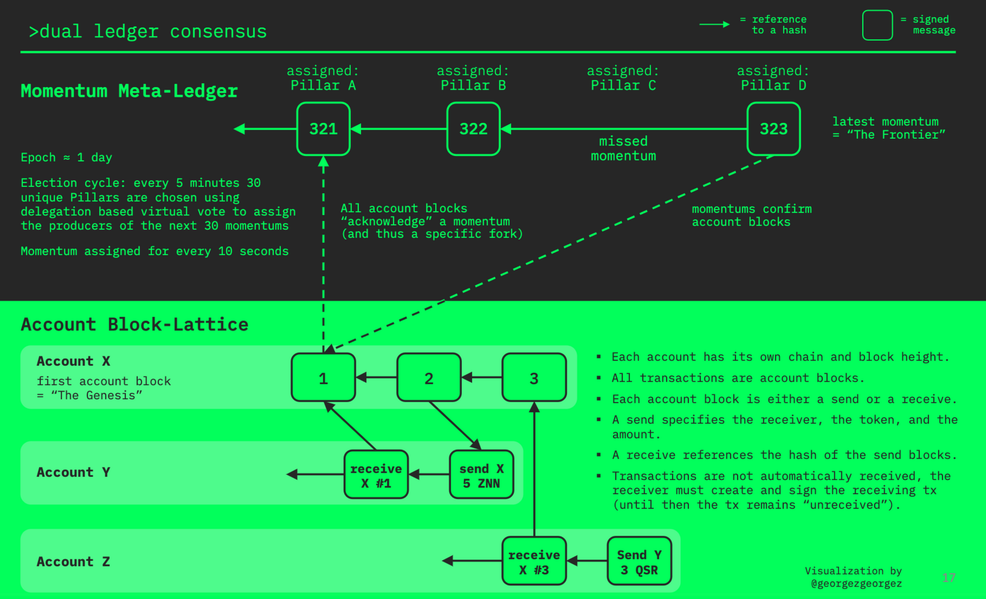Every five minutes 30 unique Pillars are selected, based on a delegation based virtual vote, to produce the next 30 Momentums. All account blocks in the block-lattice acknowledge a Momentum and thus a specific fork. Each Momentum confirms the account blocks.
