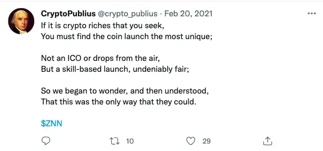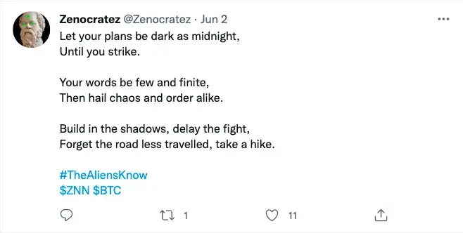 My research began with reading a series of Zenon articles, including the Ape’s Guide, Mirroring the Bitcoin Ethos and the Zenon Enigma. I delved into telegram chats, searching for certain words and phrases. I ended up on crypto twitter, searching the $ZNN symbol amongst other things. Educational content, shill content, artsy content — like a fiend I consumed it all.