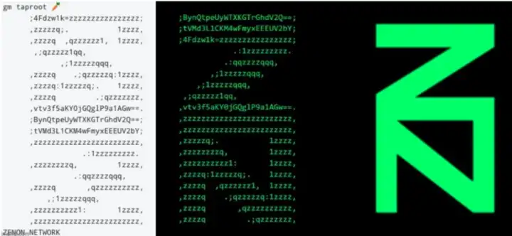 I realised where I’d heard the name Zenon before, when it was laid out before me. In late 2021, one of my Bitcoiner friends had mentioned to me in passing that someone had signed the first taproot block — block 709, 632 — with ASCII art. I realised now that it was for the Zenon logo.