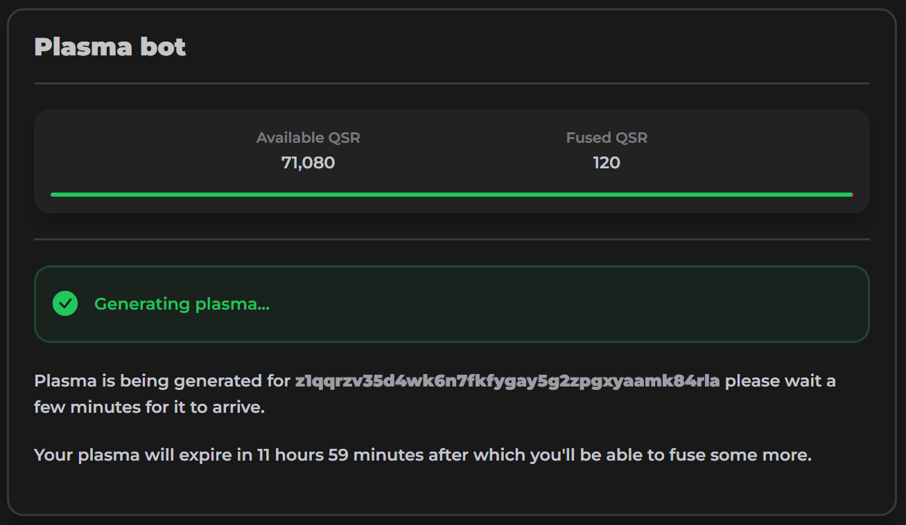 - @DigitalSloth also submitted an AZ and got approval to move all the QSR from alien-valley.io to zenonhub.io to operate a Plasma Bot. Users can submit their address and fuse up to 120 QSR for 12 hours for free.