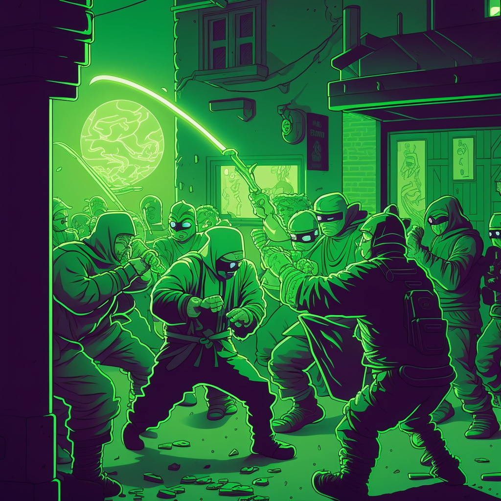 "a cartoon scene involving ninjas fighting over a bitcoin in a world where neon green is the dominant colour scheme"