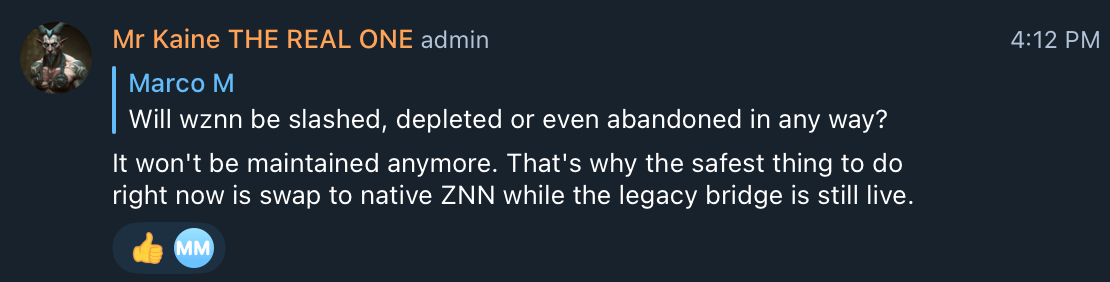 - Please swap your remaining $wZNN to native ZNN as soon as possible. The bridge is no longer supported - Mr. Kaine