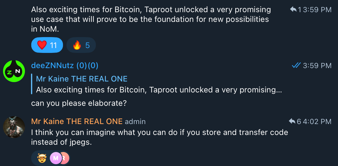Mr. Kaine hints at Bitcoin and NoM interoperability. It's unclear if he is referencing storing data on NoM like Ordinals on Bitcoin. Or, maybe he thinks we can store code on Bitcoin and leverage NoM to run it. Time will tell.